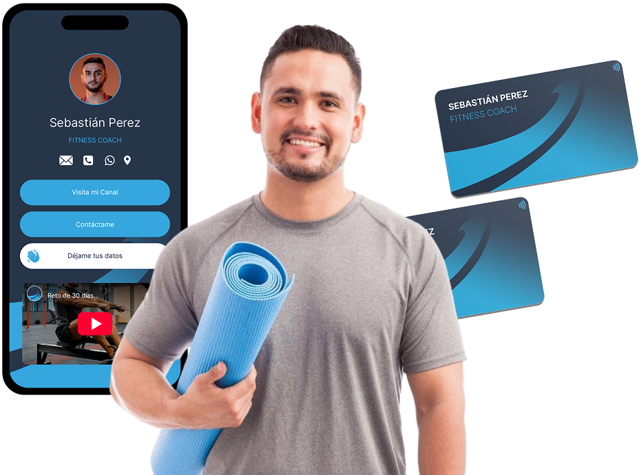 Comparte tus redes, rutinas, reservas y contacto desde una tarjeta digital. Refuerza tu marca personal en eventos, gimnasios o entrenamientos con una tarjeta física resistente y personalizada.