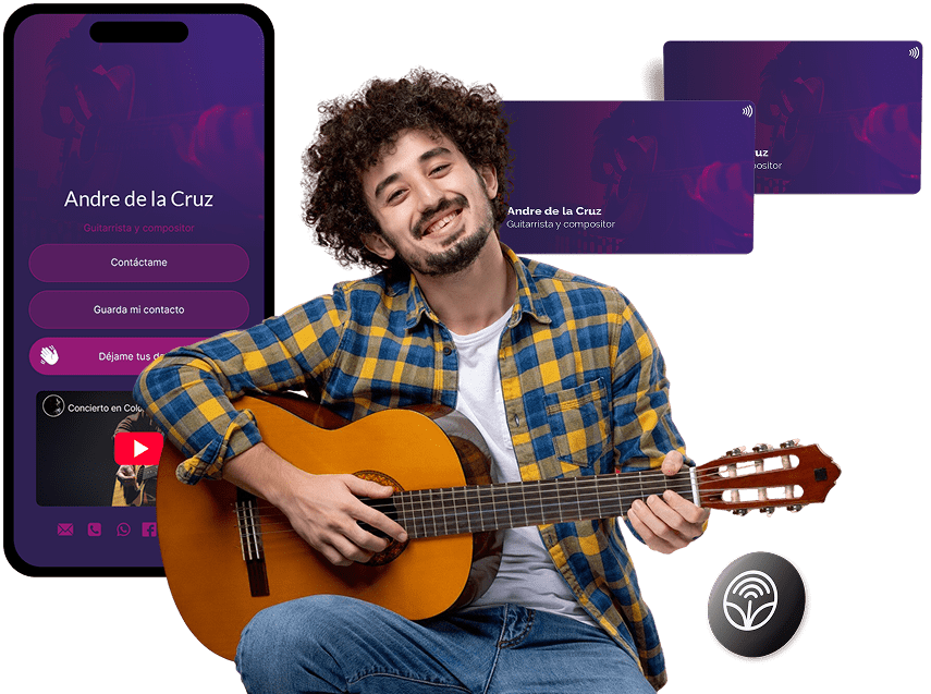 Comparte tu música, redes y eventos desde una tarjeta digital. Llévala contigo en una tarjeta física con diseño único y coloca un TAG en tu instrumento o equipo para conectar con tu público sin decir una palabra.